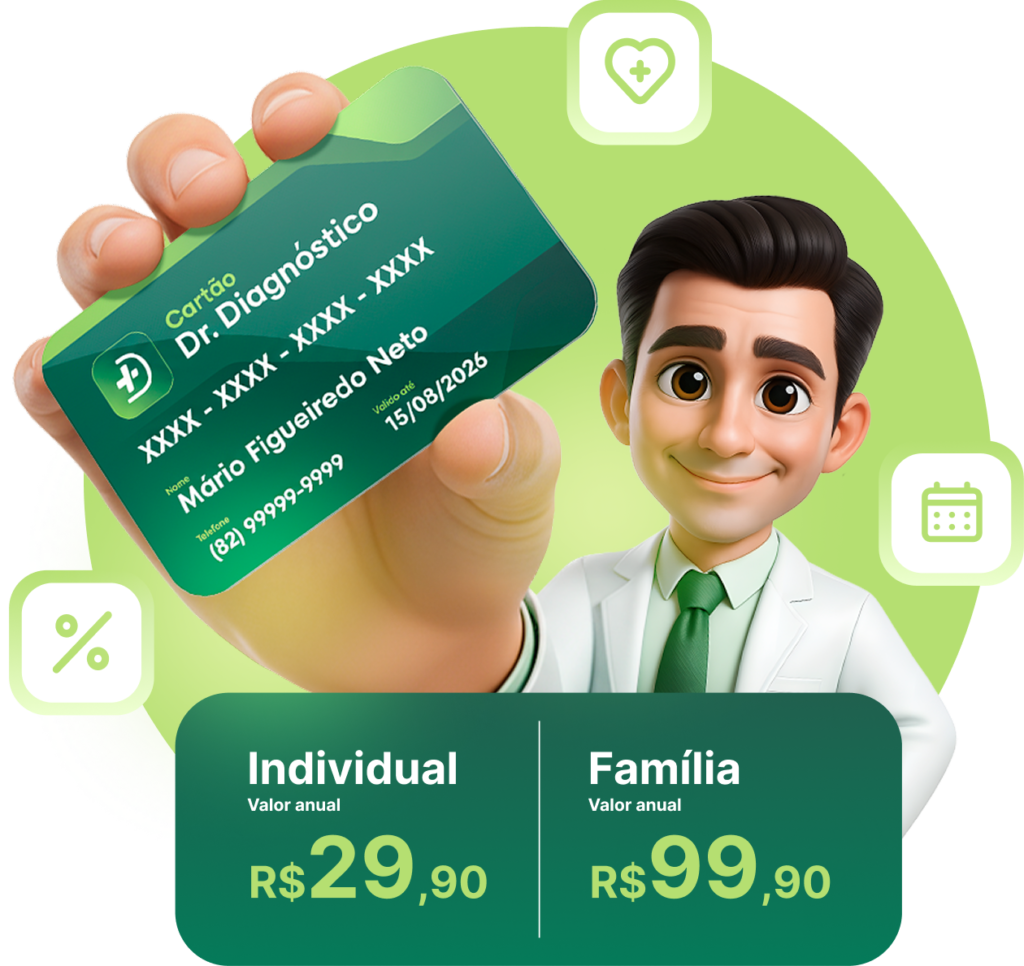 Cuidar da saúde ficou ainda mais acessível com o Cartão Dr. Diagnóstico. A partir de R$ 29,90 por ano.